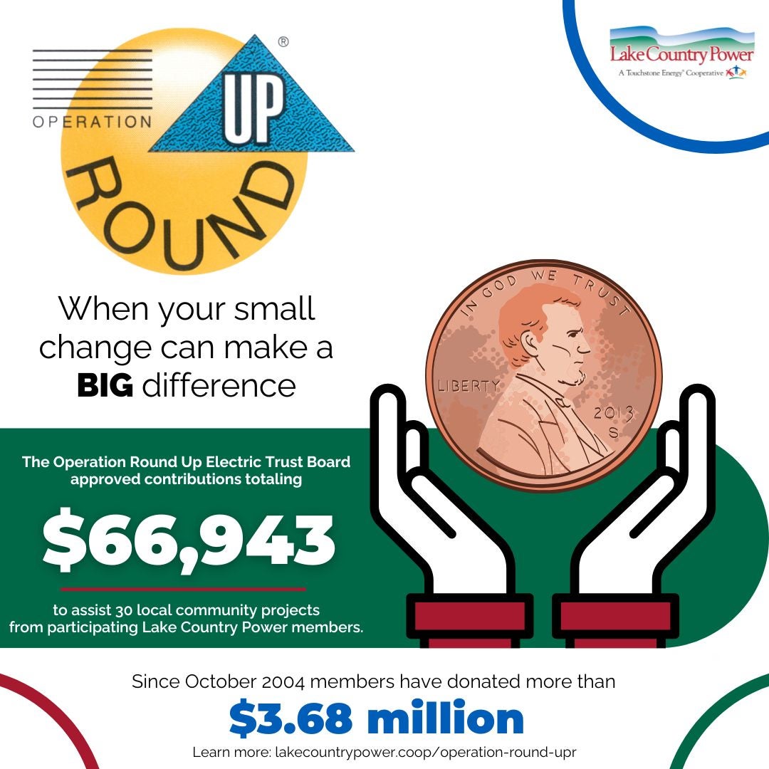 Among Lake Country Power’s 44,000 members, 70% of all active electric accounts participate in the program through voluntary contributions. Interested members can opt into the Operation Round Up® program by calling the cooperative at 800-421-9959.